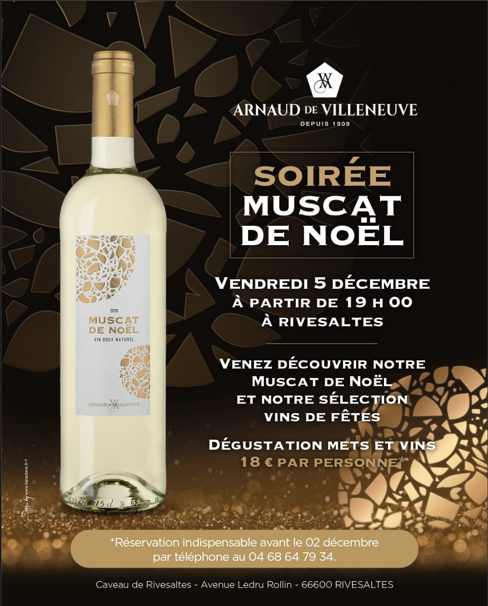 Venez découvrir le vendredi 5 décembre 2025, à partir de 19 h 00, au Caveau de Rivesaltes, notre incontournable Muscat de Noël, dans un moment de ...